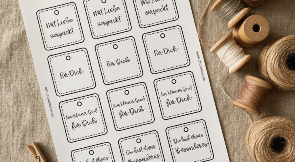 Die Anhänger, die ich für Dich vorbereitet habe, kannst Du ganz einfach zuhause ausdrucken. Sie tragen Botschaften wie „Mit Liebe verpackt“, „Ein kleiner Gruß für Dich“ oder „Du bist etwas Besonderes“. Worte, die vielleicht klein wirken, aber beim Empfänger Großes auslösen können – ein Lächeln, ein bisschen Wärme, ein schöner Moment.